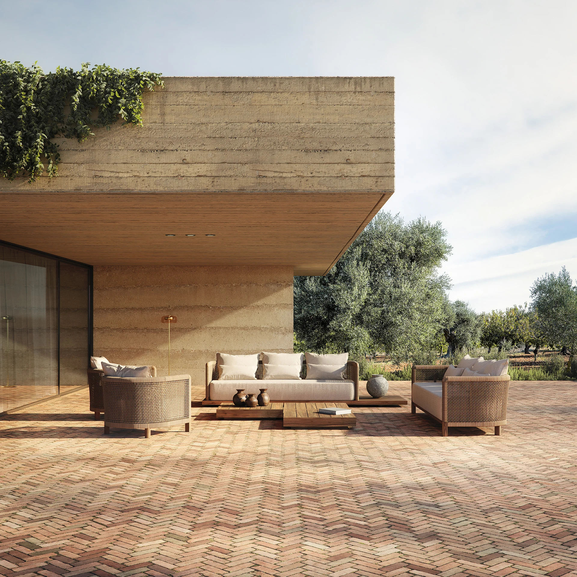 Eleganta colectiei Trena este rezultatul combinarii a doua concepte: usurinta si forta. Spatarul apare ca o piesa inconjuratoare care imbratiseaza intreg ansamblul, creand un spatiu intim unde funia devine elementul central. La canapea, ratanul se odihneste pe o platforma din lemn de tec reciclat: o structura care il sustine, il ridica si ii confera un sentiment de greutate delicata si subtila.