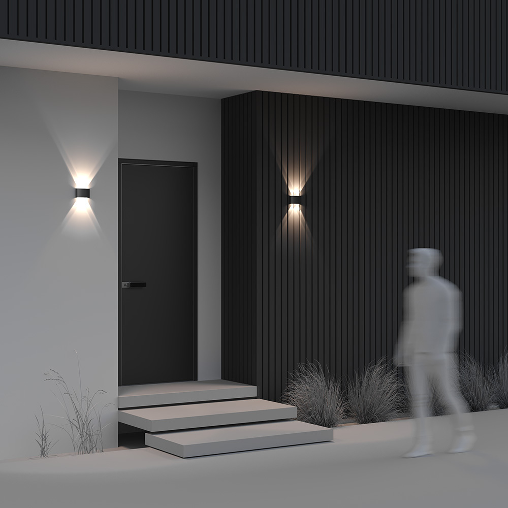 Sursa LED de 3000K generează un flux luminos bidirecțional, fiind disponibile modele cu 4 sau 6 fascicule de lumină. O soluție modernă și durabilă pentru estetica fațadelor.