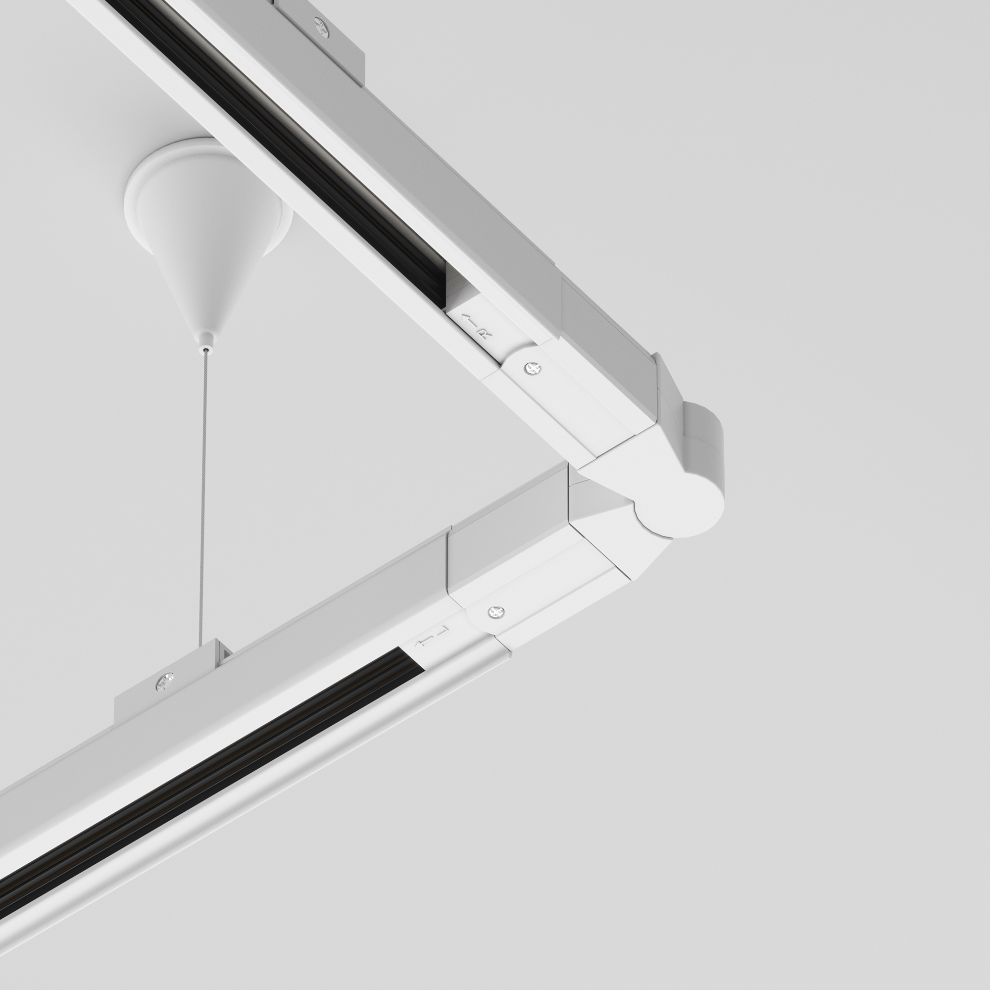 Designul său discret se integrează perfect în sistemele de șine albe, menținând continuitatea estetică a tavanului și asigurând o funcționare impecabilă.