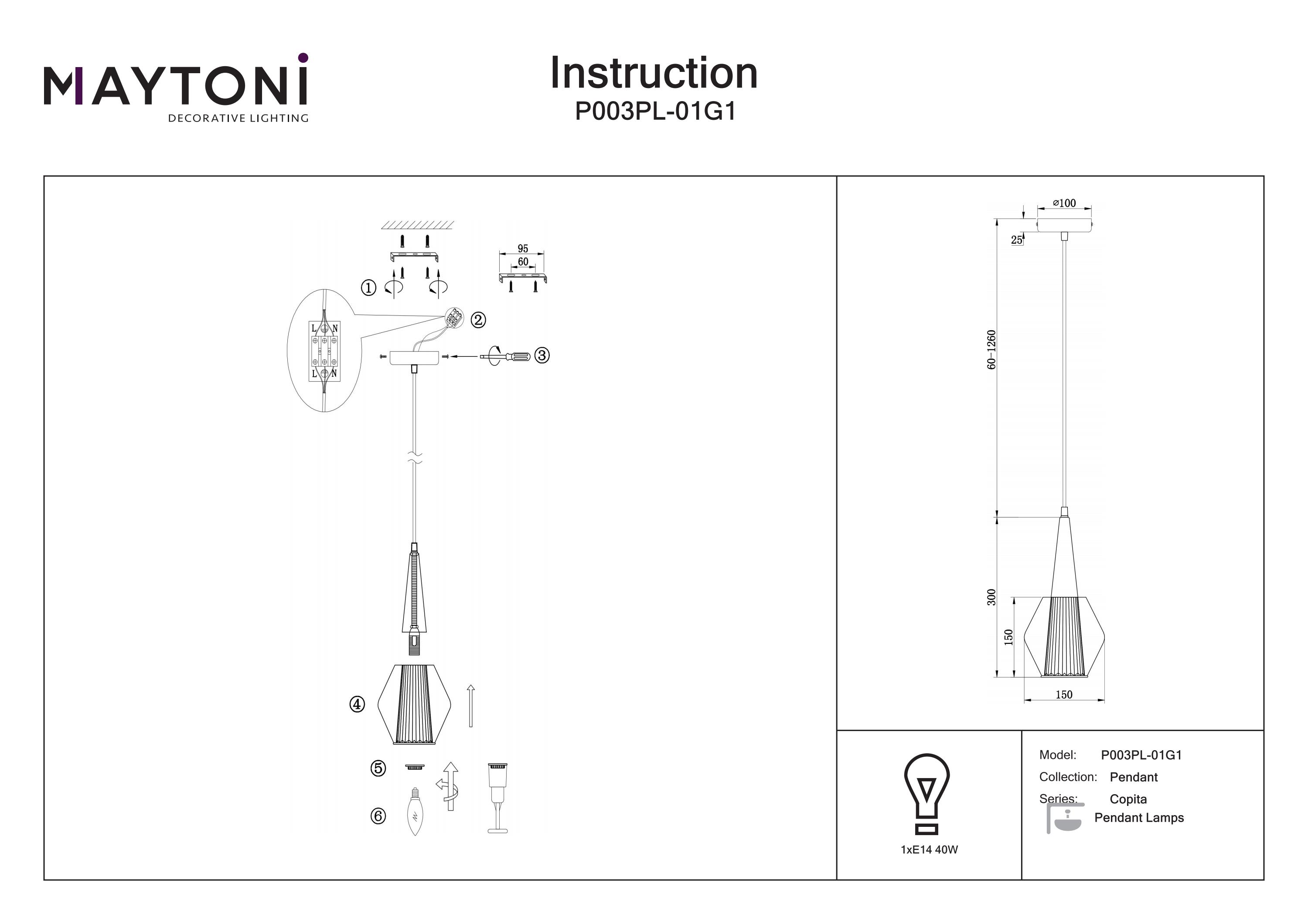 Acest corp de iluminat suspendat Maytoni Copita este fabricat din metal cu finisaj auriu. Utilizează un bec cu soclu E14, cu o putere maximă de 40W. Nu este dimabil. Are un diametru de 15 cm și o înălțime de 106 cm. Se alimentează la 220-240V AC. Este potrivit pentru iluminarea punctuală deasupra unei mese de dining, a unui bar sau într-un hol înalt.