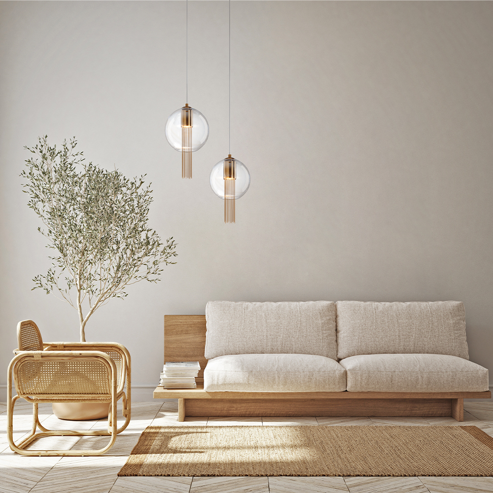 Armătură metalică într-o nuanță elegantă de bronz, completată de un abajur sferic din sticlă suflată transparentă.