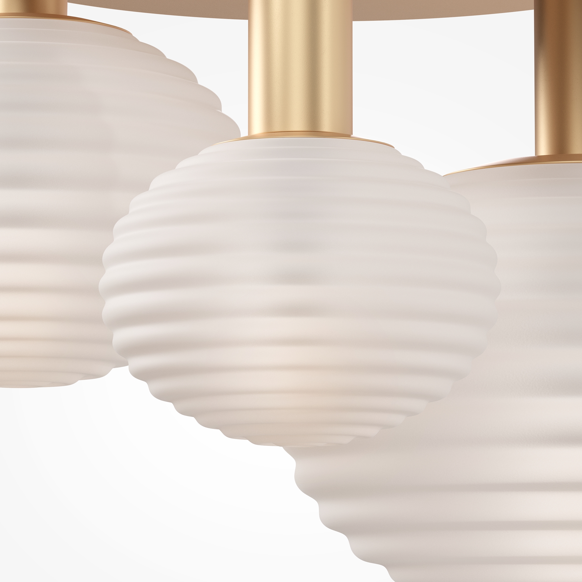 Structura metalică a acestui corp de iluminat, finisată în nuanțe de negru și auriu, susține abajururi rotunde cu un relief spiralat distinctiv. Fabricate din sticlă, abajururile sunt disponibile în culorile alb mat și fumuriu lucios, aducând un plus de dinamism și eleganță oricărui decor.