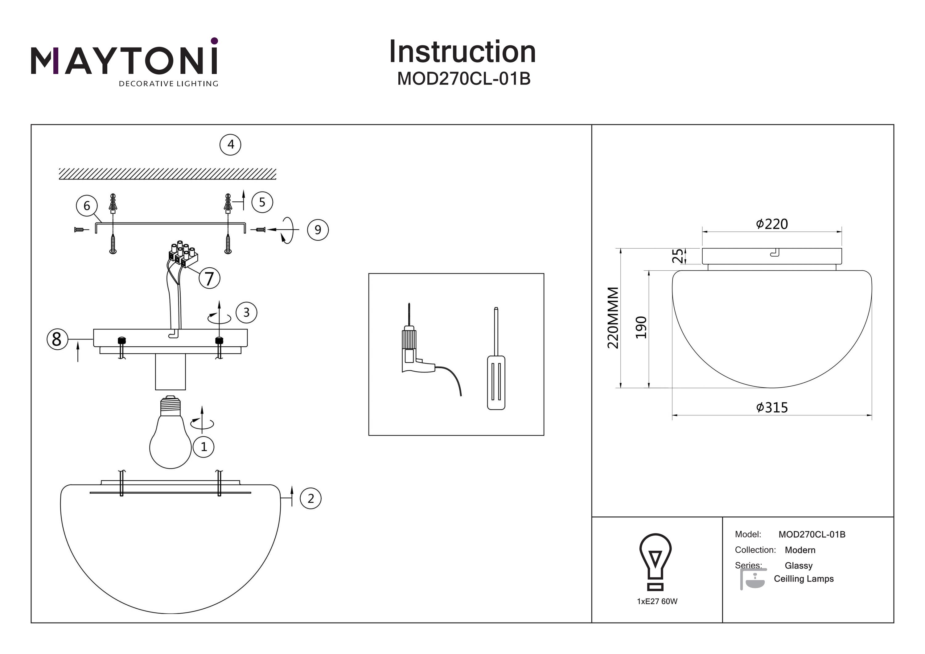 Sursa de lumină utilizează un bec cu soclu E27, oferind o soluție practică și estetică pentru holuri sau camere cu tavan jos.