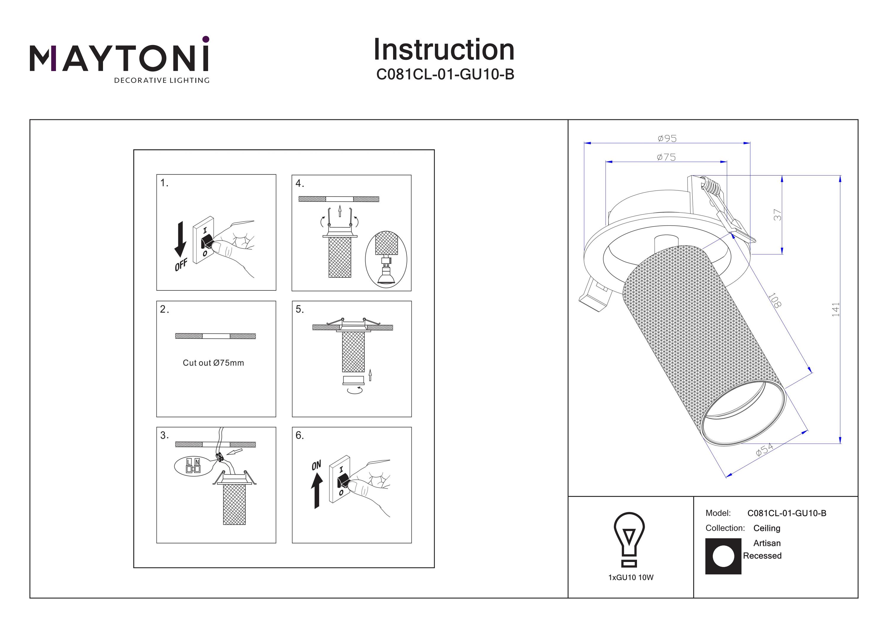 Acest model este prevăzut cu soclu GU10, permițând utilizatorului să aleagă intensitatea și temperatura luminii dorite. Instalarea aplicată facilitează integrarea rapidă pe plafon, oferind o soluție eficientă pentru un iluminat de accent direcționat și precis.
