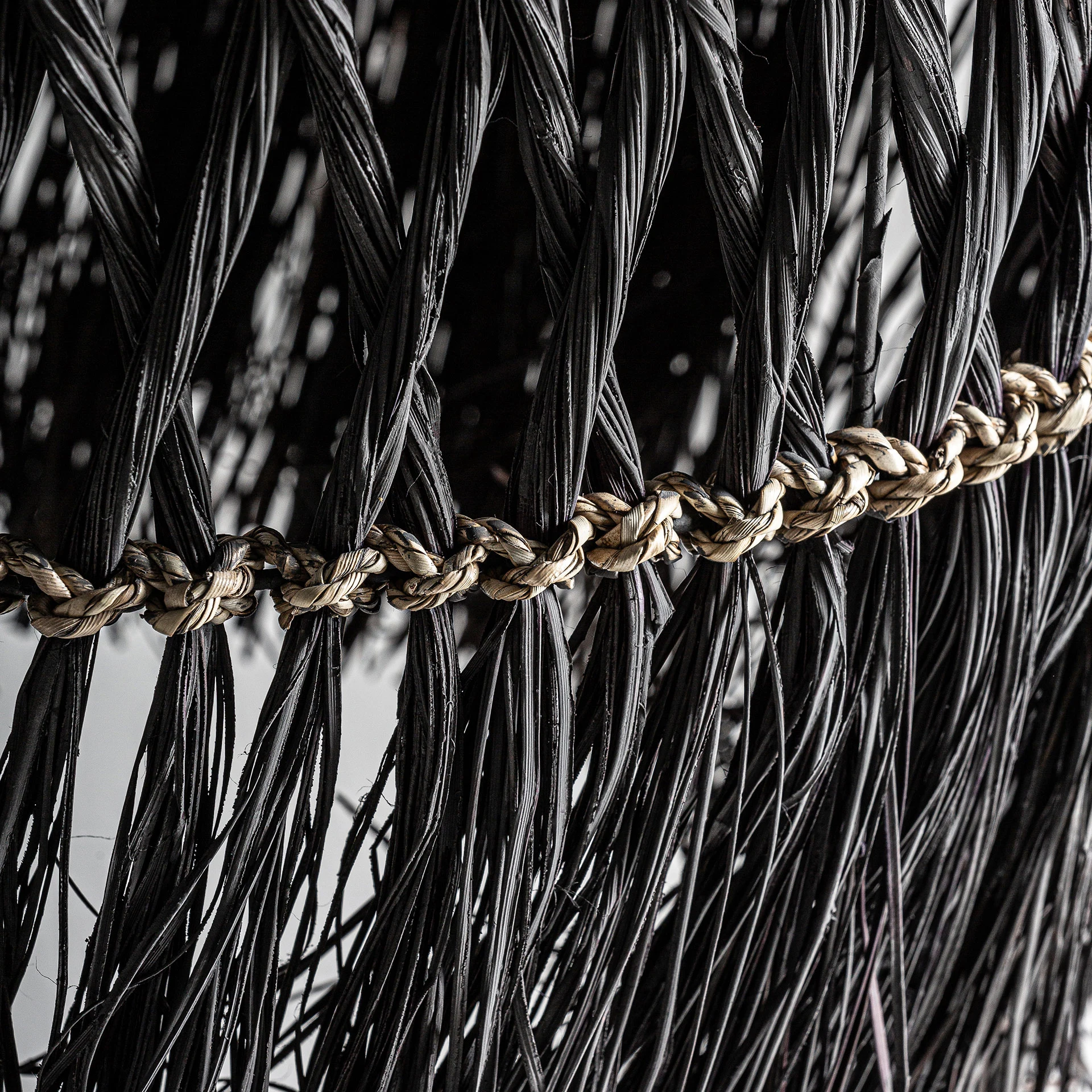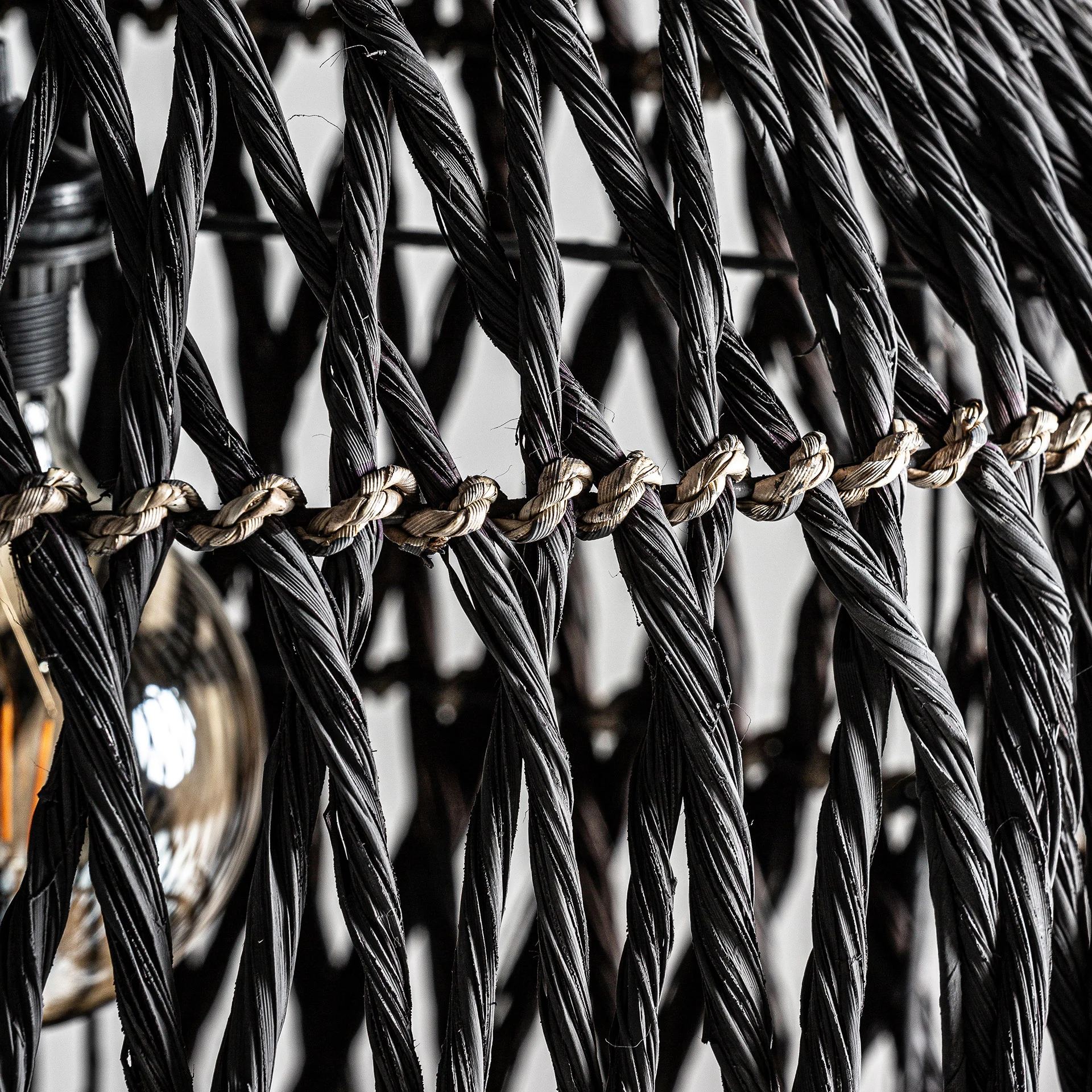 Lampa de tavan, in stil boho, din fibra naturala neagra, combinata cu fier.