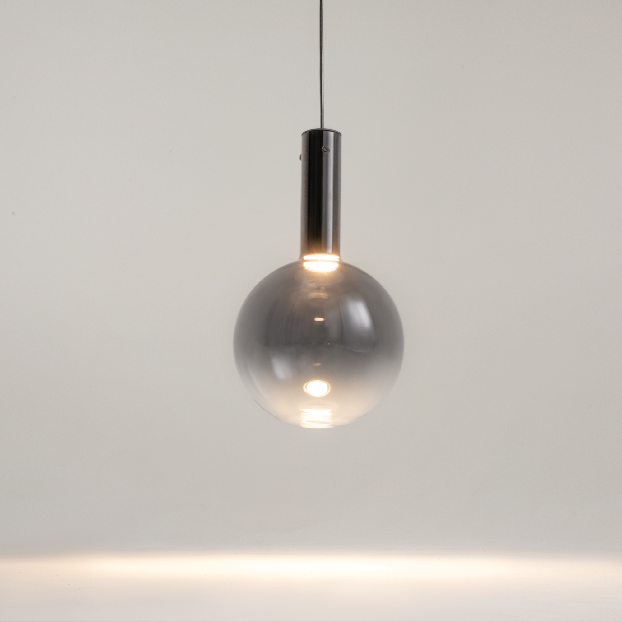 Această suspensie elegantă dispune de armături metalice în culorile negru și alb, completate de un difuzor sferic din sticlă suflată cu o bază cilindrică alungită. Designul este disponibil în nuanțe rafinate de negru fumuriu și alb mat, integrând o sursă de lumină LED cu temperatura de culoare de 3000K poziționată la baza corpului.