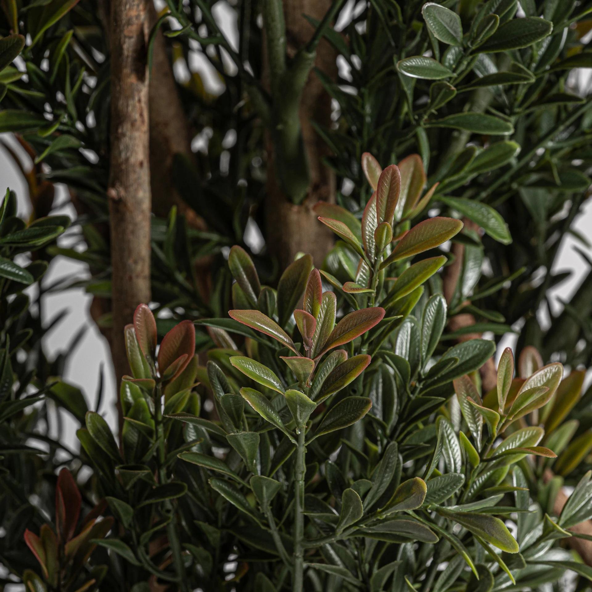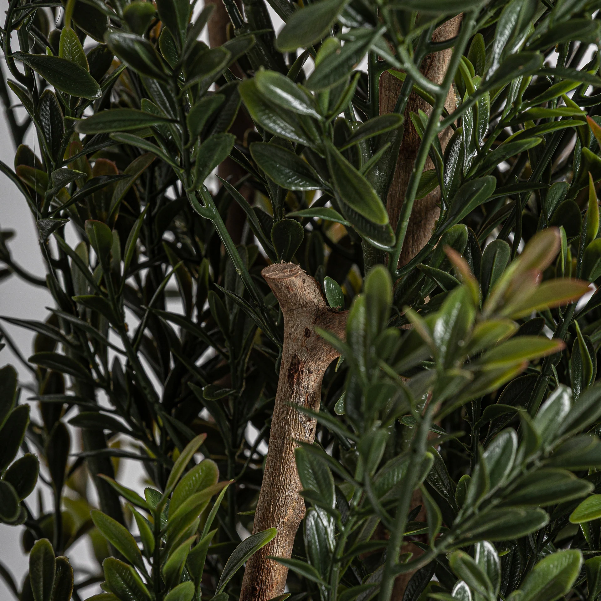 Boj plant, stil clasic, fabricata din polietilena verde, combinata cu polipropilena neagra si lemn maro.