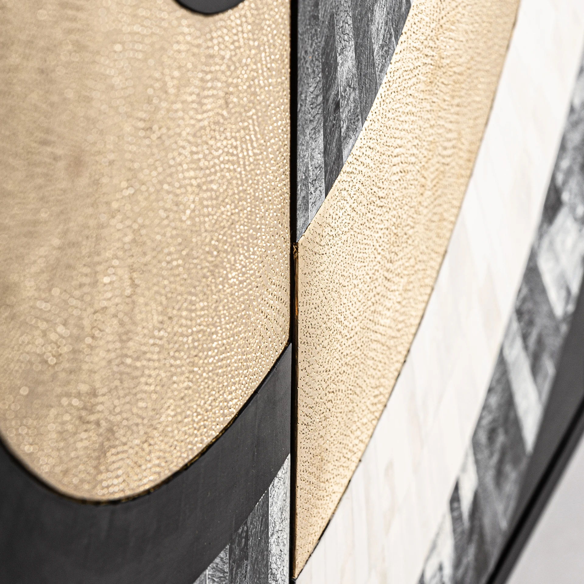 Bufet daru, stil contemporan, realizat din lemn mdf negru, combinat cu os alb si alama aurie. Produs demontabil.