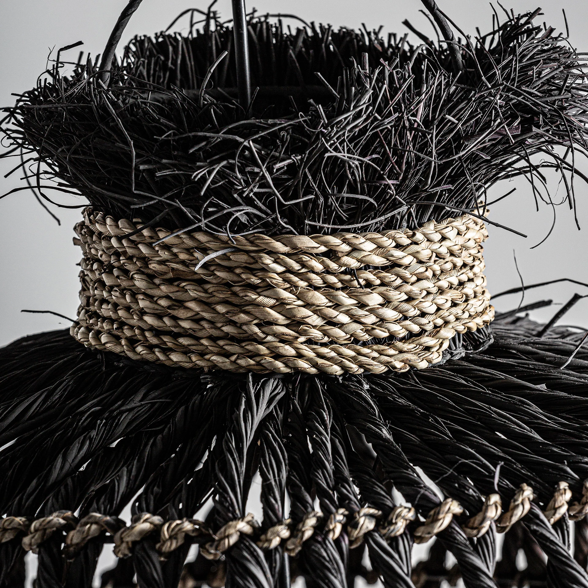 Lampa de tavan, in stil boho, din fibra naturala neagra, combinata cu fier.