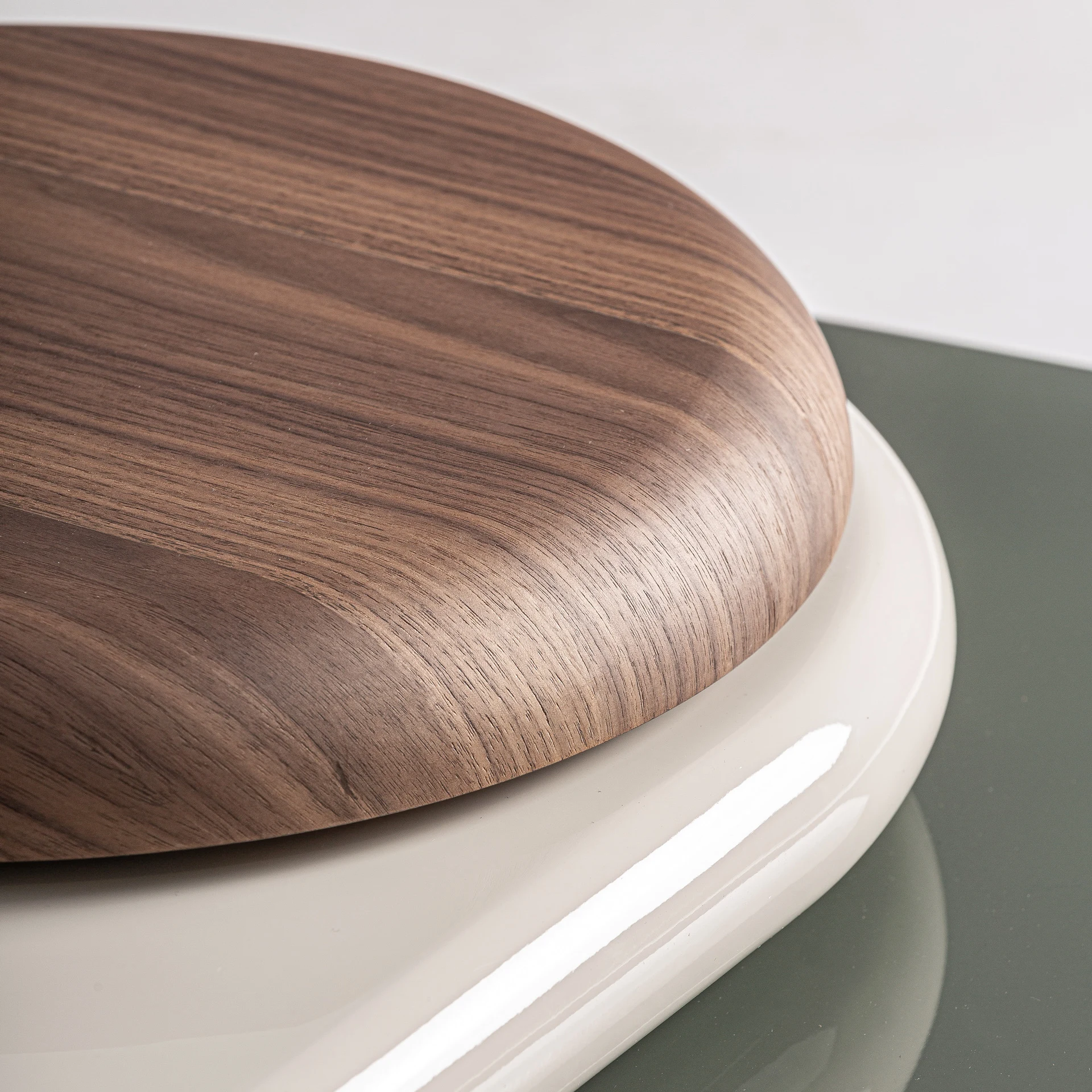 Masa de cafea Proaza, stil contemporan, realizata din lemn MDF vopsit verde cu finisaj lucios, combinata cu furnir nuc maro cu finisaj lucios.