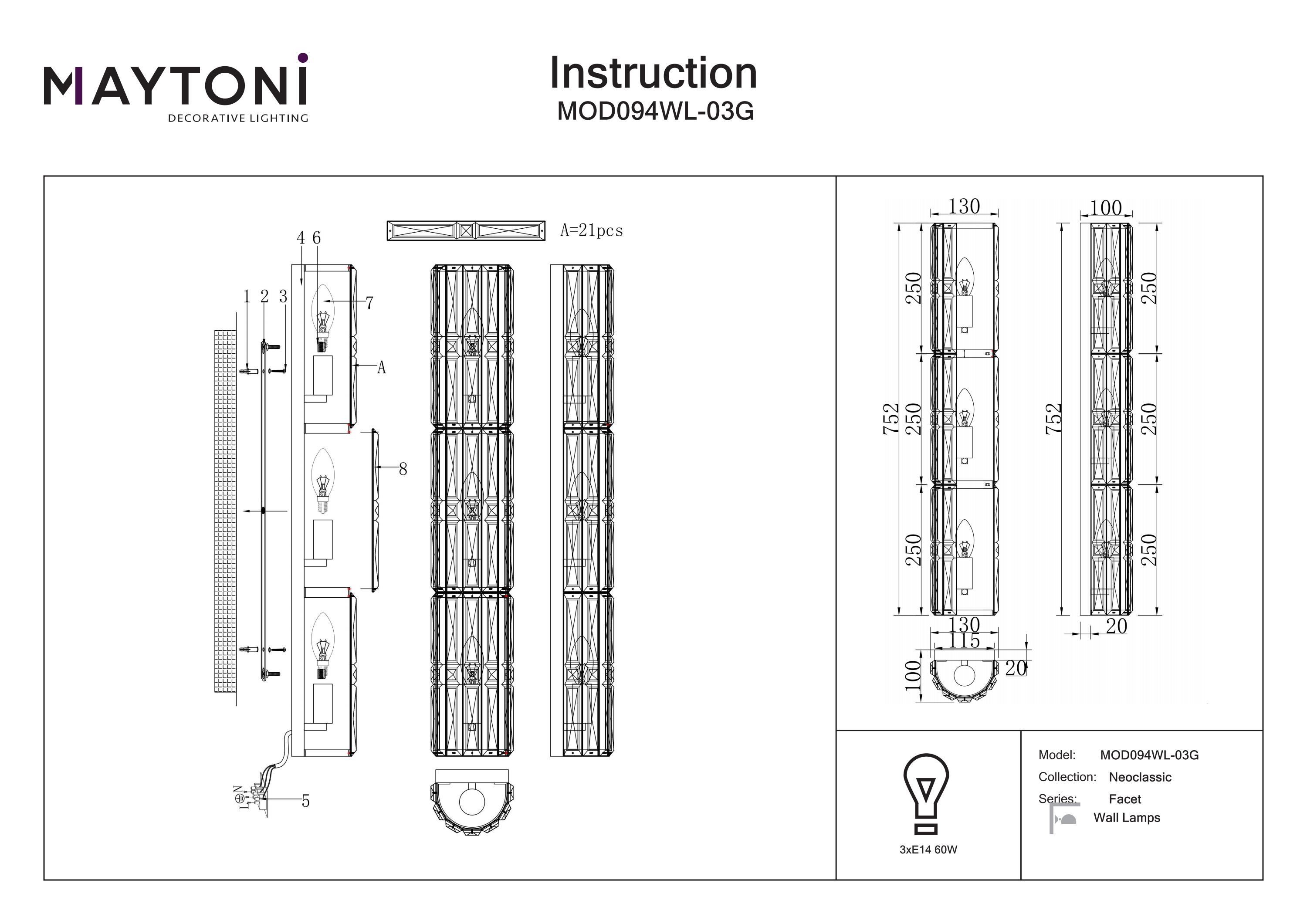Structura metalică a acestui corp de iluminat este finisată în nuanțe rafinate de crom și auriu, fiind completată de elemente decorative din cristal de sticlă transparentă. Fațetarea arhitecturală a cristalelor conferă o strălucire deosebită și un aspect sofisticat în orice spațiu interior.