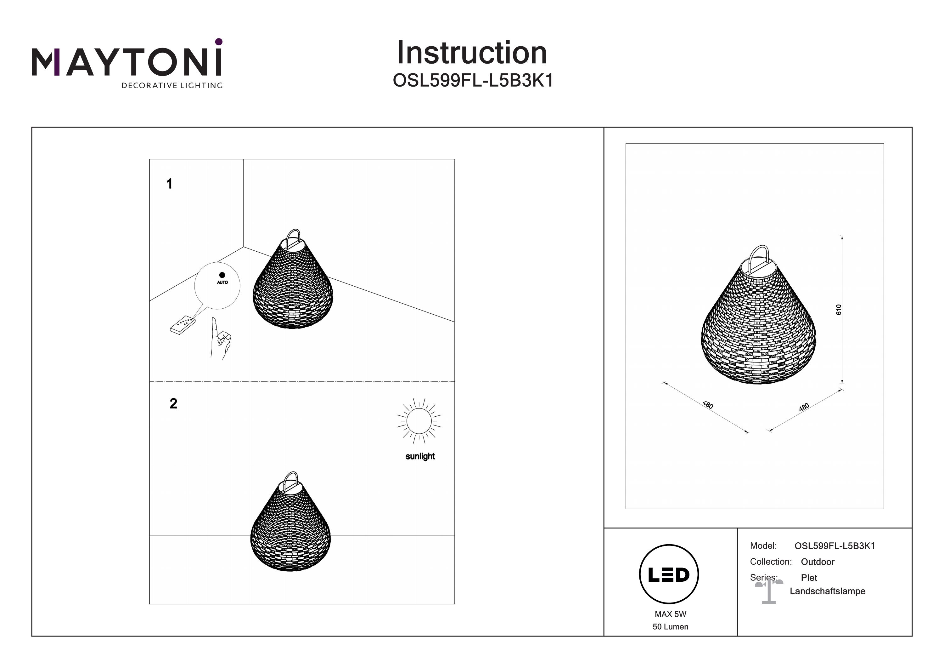 Carcasă realizată din ratan împletit manual în nuanță neagră, alimentată prin baterie solară cu o autonomie de funcționare de până la 12 ore. Designul fără cabluri și mânerele de transport convenabile permit instalarea și mutarea ușoară în orice locație.