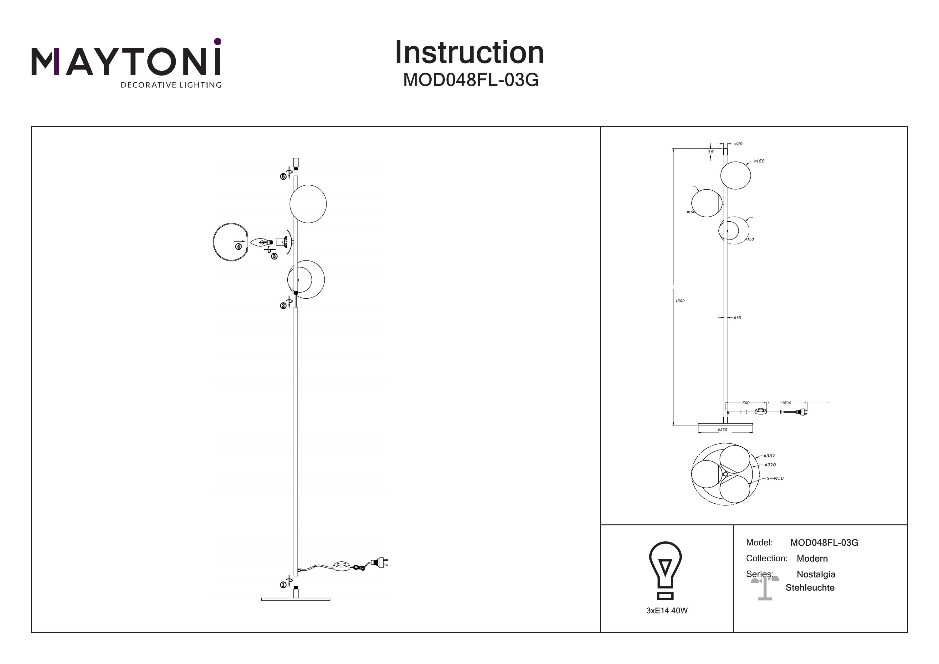 Corpul de iluminat dispune de o armătură metalică finisată într-o nuanță elegantă de auriu mat, completată de abajururi sferice din sticlă suflată mată. Designul său se remarcă printr-o asimetrie modernă, fiind o alegere ideală pentru a adăuga un plus de stil și rafinament oricărui interior contemporan.