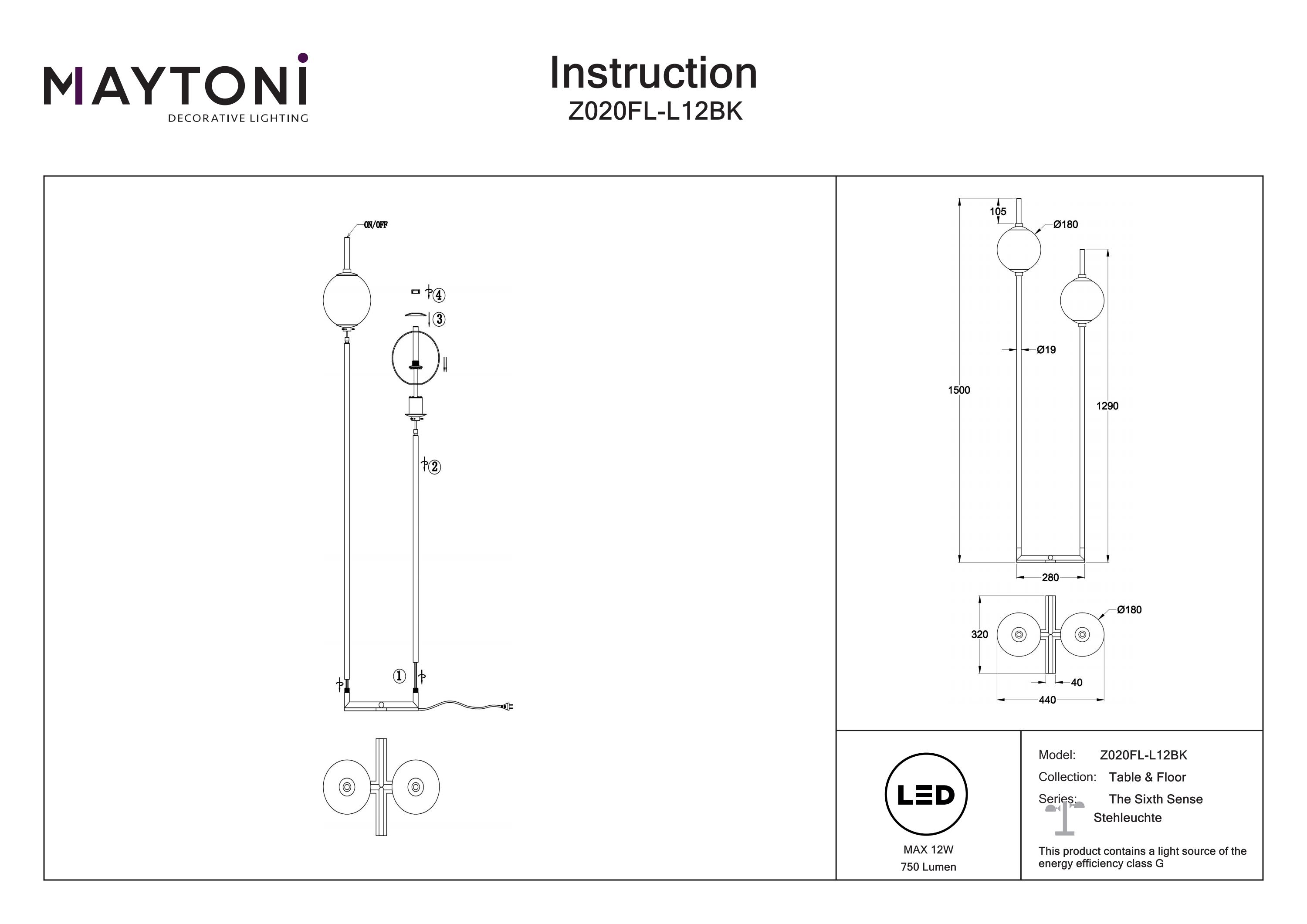 Dotată cu armătură metalică neagră și abajururi sferice din sticlă albă, această lampă utilizează o sursă de lumină LED cu o temperatură de culoare caldă de 3000K. Întrerupătoarele sunt poziționate practic în partea superioară a cadrului pentru o utilizare facilă.