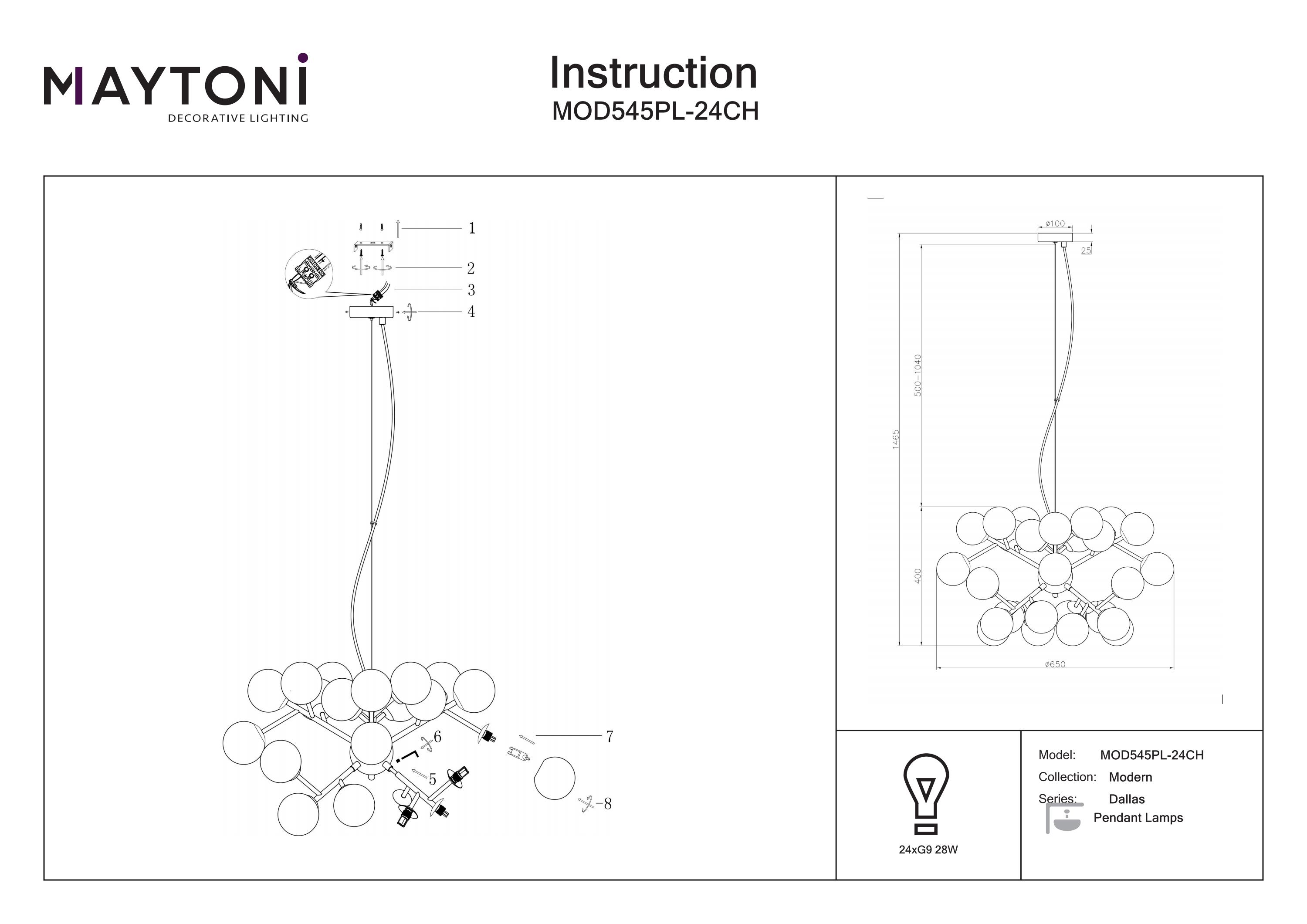 Înălțimea suspensiei este complet reglabilă prin intermediul cablului, permițând o adaptare perfectă la volumul camerei. Corpul de iluminat este proiectat pentru utilizarea cu becuri dotate cu soclu G9.