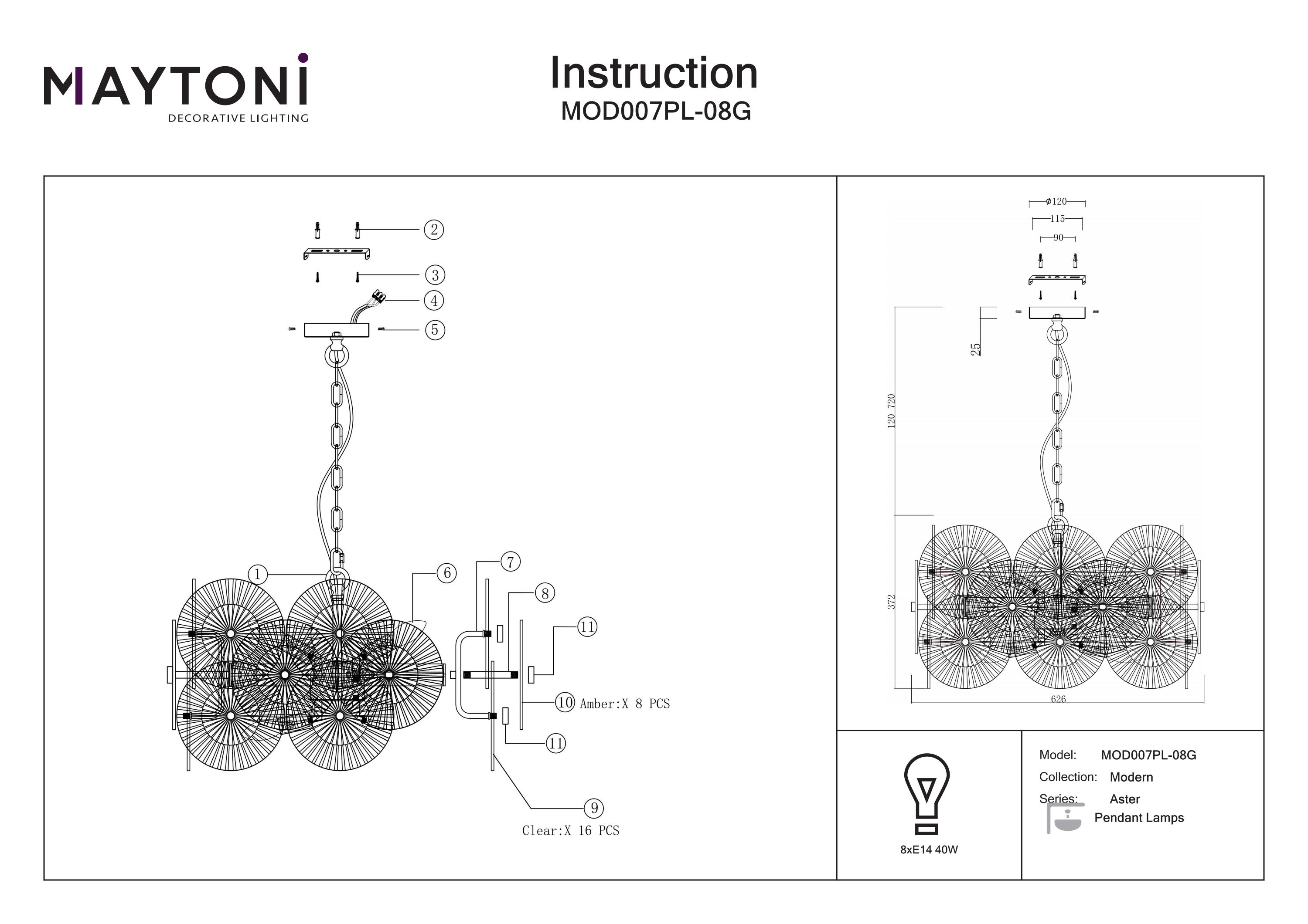 Lustră elegantă cu armături metalice aurii, decorată cu elemente sferice din sticlă turnată ondulată. Designul se remarcă prin combinația armonioasă de nuanțe de chihlimbar și sticlă transparentă.