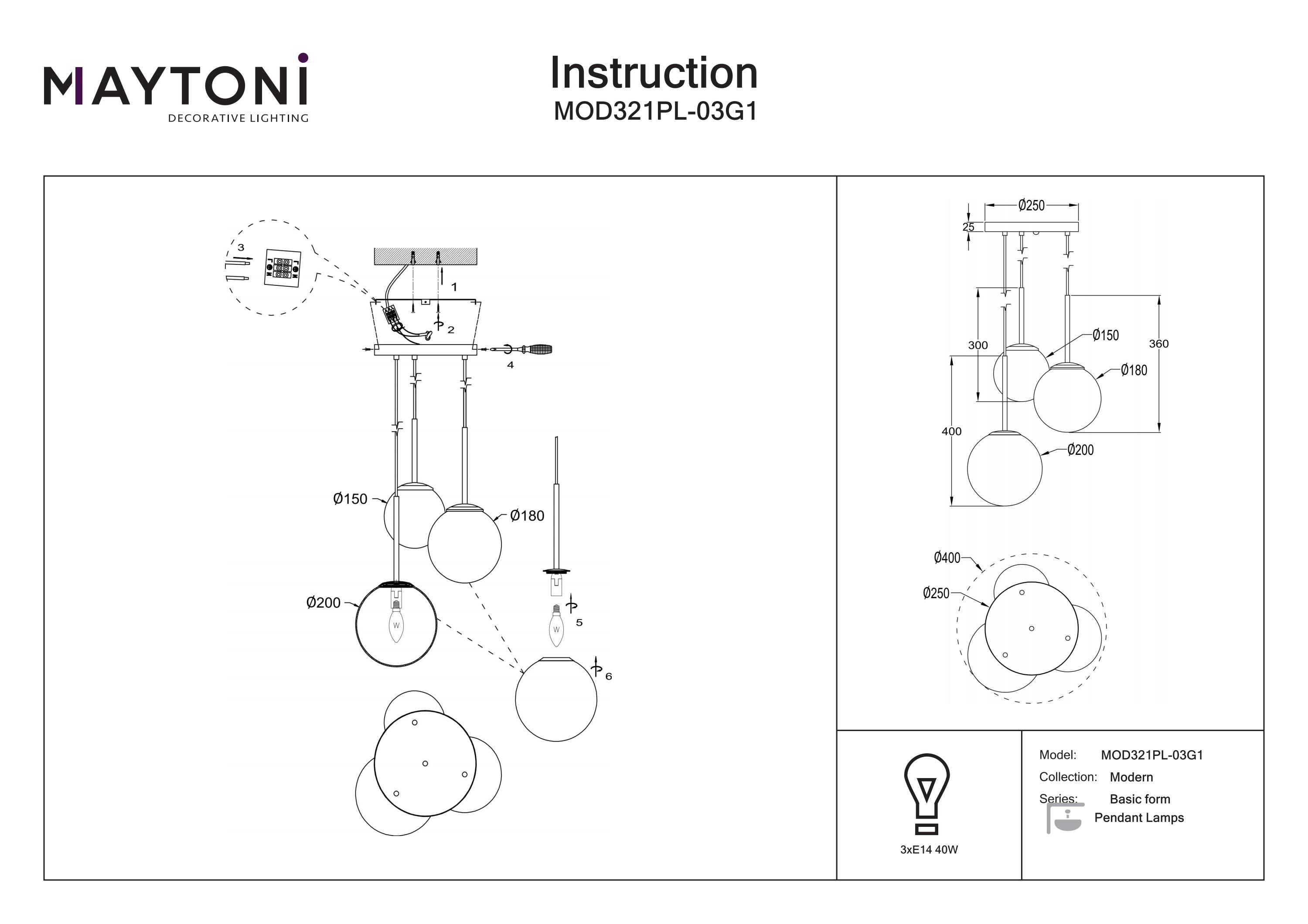 Corpul de iluminat este realizat din metal de înaltă calitate, fiind disponibil în finisaje elegante de auriu, alb mat sau negru mat. Designul este definit de abajururi rotunjite din sticlă albă mată, care asigură o difuzie uniformă și plăcută a luminii.