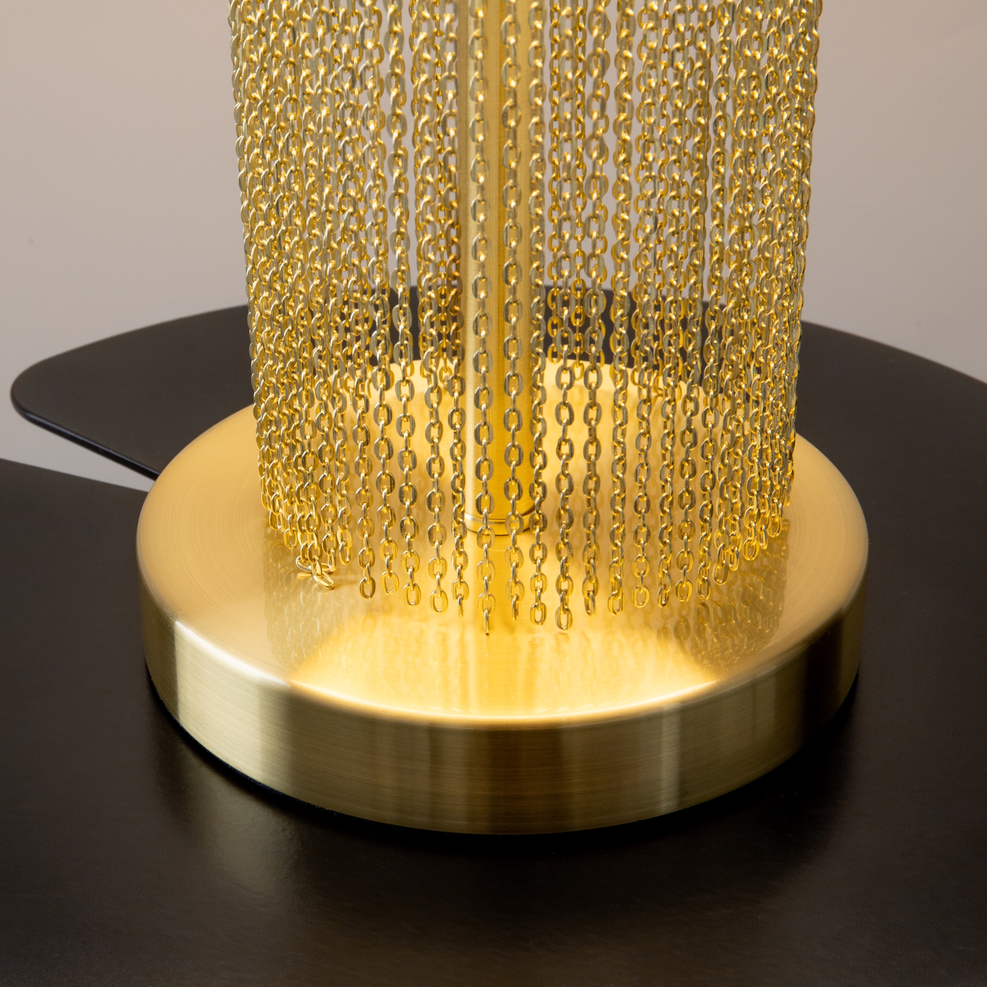 Această lampă dispune de o structură din oțel inoxidabil auriu și un abajur din material textil alb. Lanțurile decorative asortate subliniază eleganța piesei.